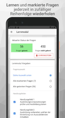 Ein Lernmodul bietet die Möglichkeit, anhand einer Anzahl zufällig ausgewählter Fragen aus den verschiedenen Handlungsfeldern zu trainieren oder alle zuletzt markierten Fragen erneut durchzugehen.