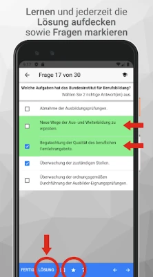 Im Lernmodul können Sie sich jederzeit die richtigen Lösungen anzeigen lassen. Gleichfalls lassen sich jederzeit weitere Fragen auf die Merkliste setzen und später erneut abrufen.