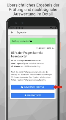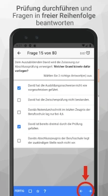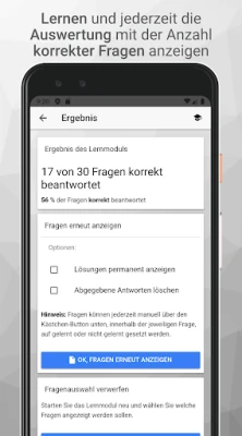 Besonders viel Wert wurde bei der Erstellung der App auf eine einfache und intuitive Bedienung nach den Google Design Empfehlungen gelegt. Sie können wie bei der realen Prüfung frei zwischen den Fragen springen und diese so in beliebiger Reihenfolge beantworten sowie ggf. nachträglich korrigieren.