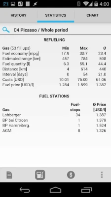 ✔ 11 interactive charts with touch-sensitive data points: fuel consumption (power consumption), costs, travel distance and more