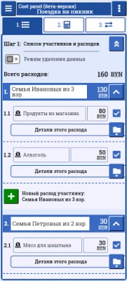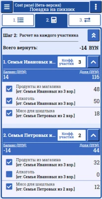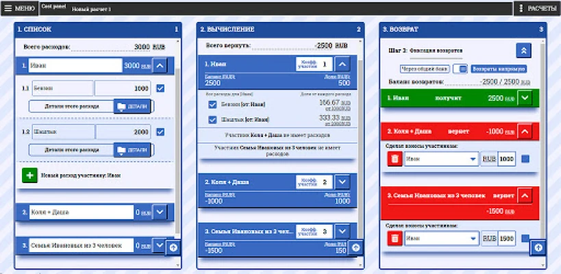 1) Добавить участников и их расходы 2) Проверка/Настройка расчета 3) Зафиксировать возвраты