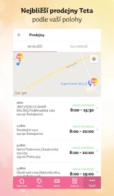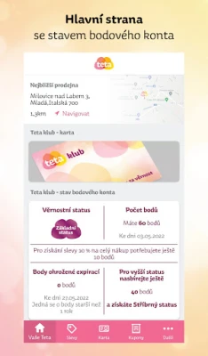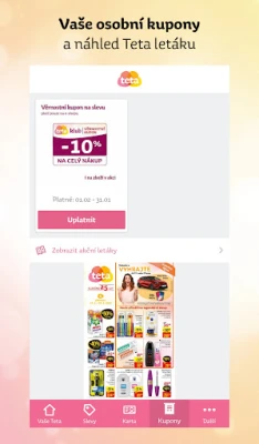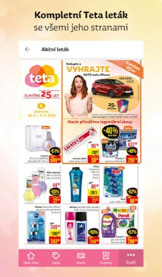 Aplikace Teta drogerie vám přináší: - informace o aktuálních slevách a novinkách - možnost zobrazit si aktuální Teta leták - nalezení nejbližší Teta prodejny, včetně kontaktů a otvírací doby - jednoduché zobrazení vaši Teta karty pro načtení výhod na pokladně - snadno dostupné i vaše osobní kupony – již nemusíte nic tisknout